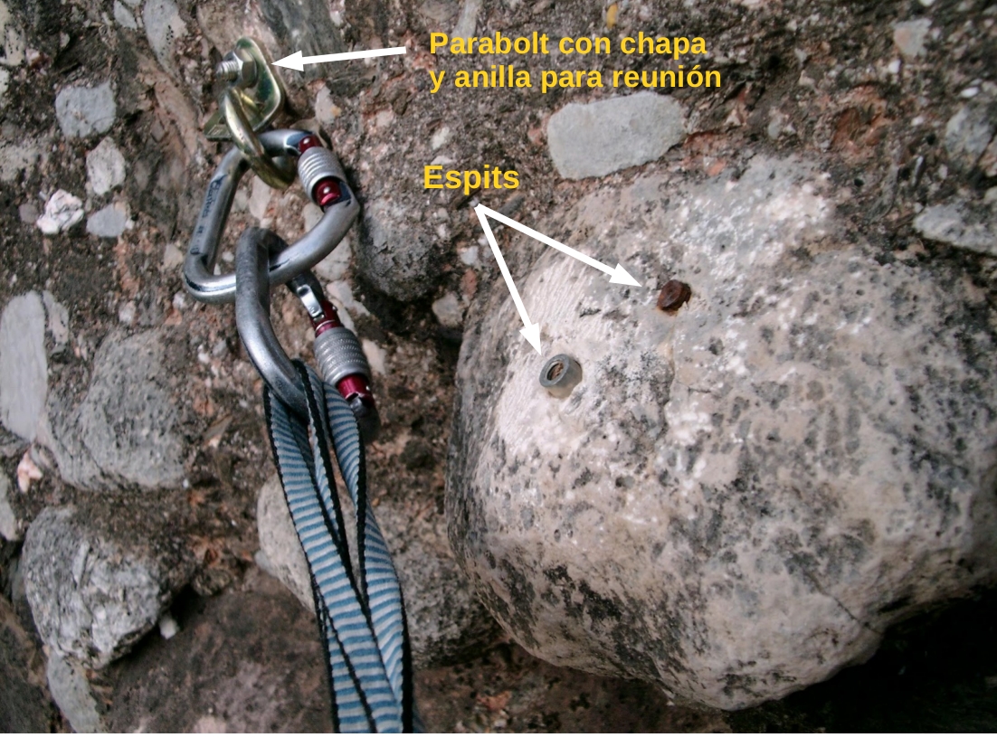 Parabolt: Es muy parecido al espit pero la longitud del tornillo es tres veces más grande 9 cm, lo que confiere una seguridad mucho mayor. El problema de este tipo de anclaje es el colocarlo. Es necesario realizar un orificio en la roca de varios centímetros para colocar el anclaje. Aún así la gente prefiere utilizar este tipo de anclaje y nosotros se lo agradecemos.